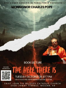 Monsignor Pope will lecture in the Church at Saint John the Beloved about his new book The Hell There Is on October 28, 2025 at 7pm. Monsignor will also include a discussion on Purgatory, so his presentation will be great preparation for All Souls Day! Food and drinks will be offered at 6pm. Monsignor’s books will be available for sale and signing.