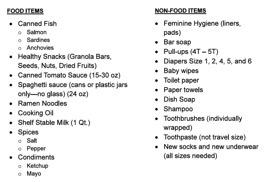 Please no glass containers, over-sized cans or bottles, or items past their expiration dates or “use by” dates.